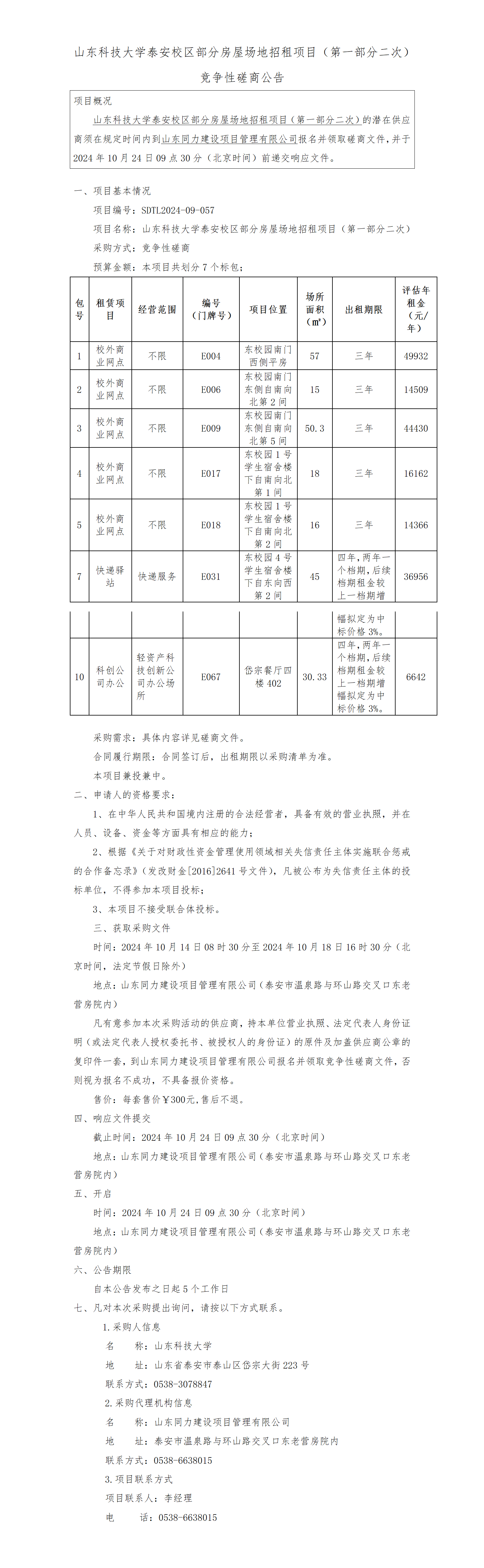山東科技大學泰安校區(qū)部分房屋場地招租項目(第一部分二次)競爭性磋商公告